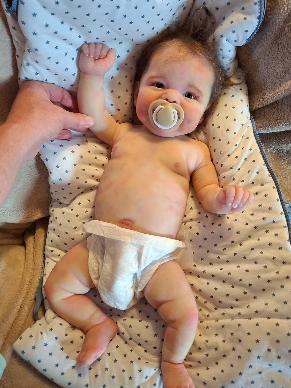 | Detailed Description: Gender: boy Head Material: Silicone Body Material: Silicone Arms: Full Length Legs: Full Length Stock: Available Eyes: Open Eye Color: Other Lashes: Rooted Hair: Rooted Paint: Heat Set Paint Weighting: Fine Glass Beads Weighting: 10.5lbs Skin Color: Mottled Pacifier: Included Pacifier Type: Magnetic Pacifier Smoke Free Environment: Yes Pet Free Environment: No Category: Reborn Baby->Fully Reborned Seller: Is the sculptor Availability: Ready to be shipped |